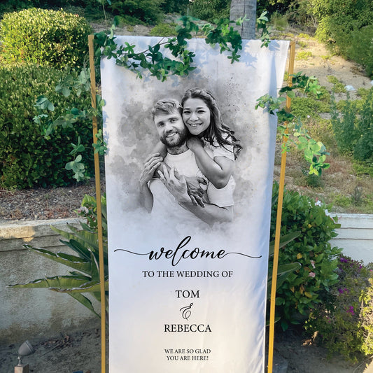 Fabric Wedding Banner, Custom Watercolor Portrait from Photo on Banner, Wedding Welcome Sign, Wedding Decor, Wedding Rehearsal Banner, Favor